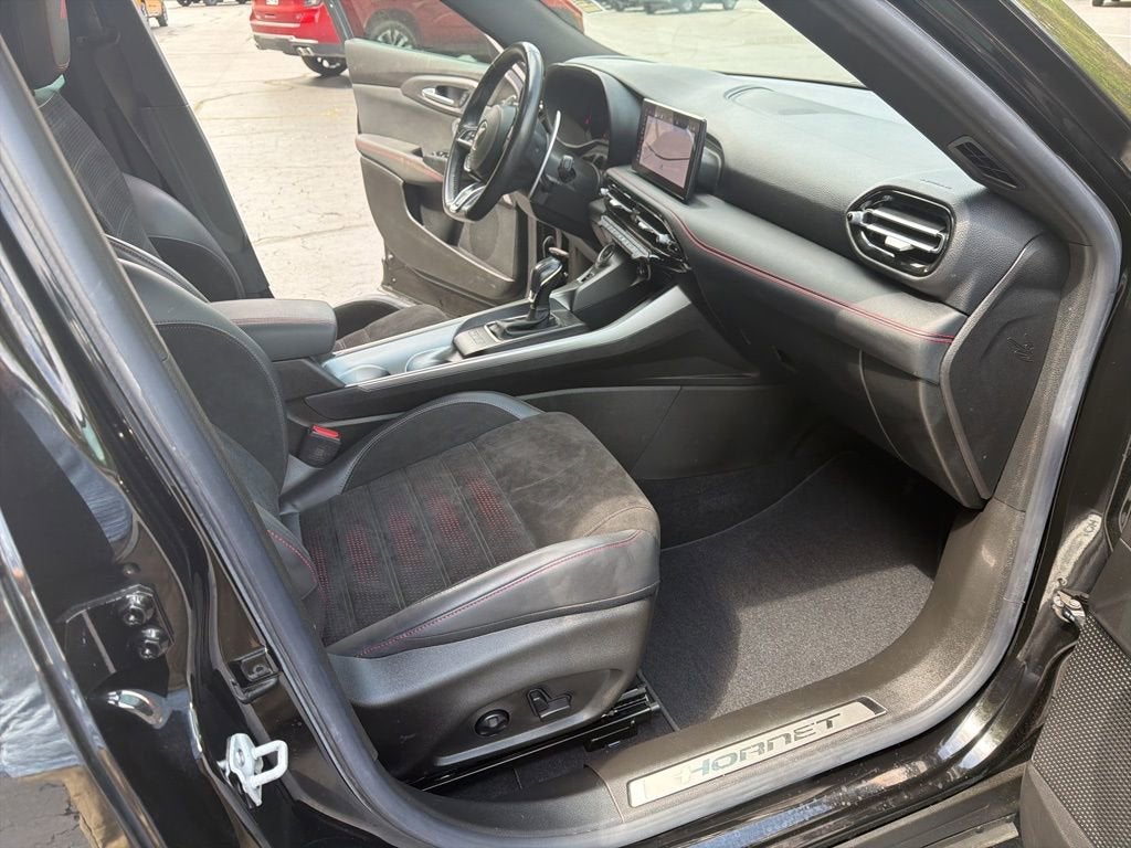 Step inside the Hornet R/T Plus and you'll be surrounded by a wealth of premium features designed to enhance your driving experience. Slip into the supportive, ventilated leather seats and enjoy the heated steering wheel, dual-zone climate control, and the advanced Uconnect 5 infotainment system with navigation. The Harman Kardon premium audio system will immerse you in your favorite tunes, while the power liftgate and 60/40 split-folding rear seats provide the versatility to accommodate your lifestyle.
